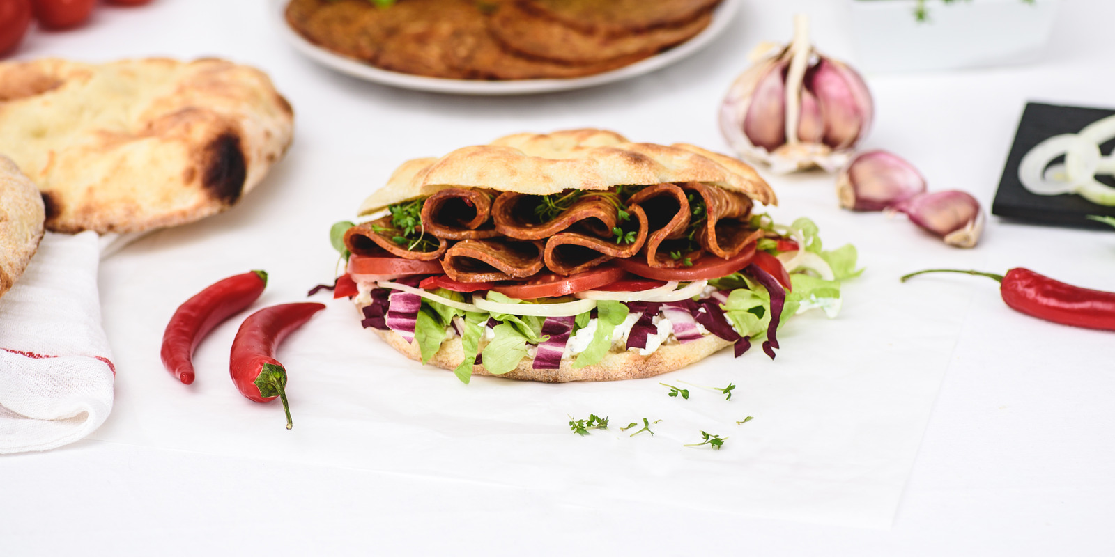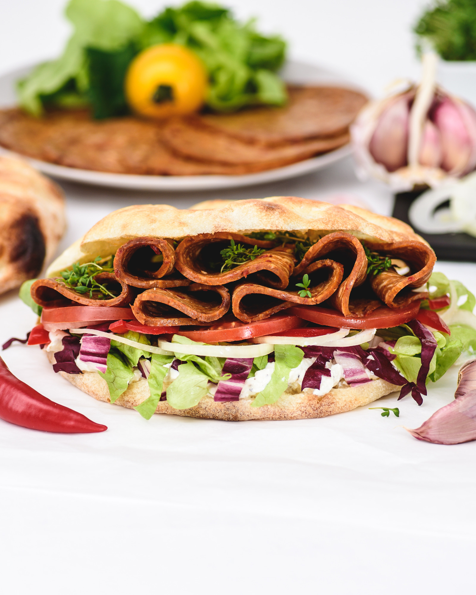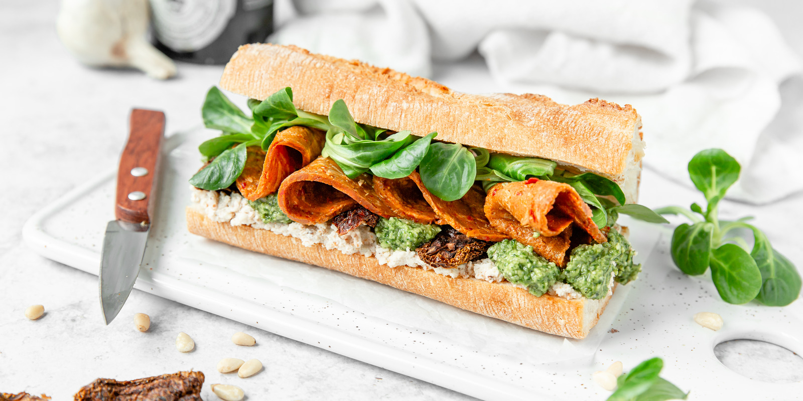 70 % seitan* (eau, protéine de BLÉ*), protéine de BLÉ* texturée (protéine de BLÉ*, farine de BLÉ*), huile de tournesol*, extrait de levure*, poivron doux*, 2 % ail*, épices*, oignons*, sel, épaississants (gomme de guar* et farine de caroube*), acidifiant : acide lactique, extrait de poivron*. * = issus de l'agriculture biologique.100 g