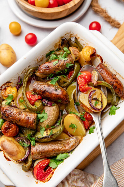 - Sortir le plat du four et laisser-le refroidir quelques minutes. Garnir ensuite d’herbes hachées, de sel et de poivre. Servir chaud.