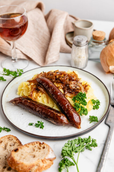 Inspiré d’un plat traditionnel allemand sucré – salé de la région de Westphalie, ce plat vegan est préparé à la base avec des oignons frits, du bacon ou du boudin noir. Vous pouvez le réaliser avec les Hot-Griller qui s’accommoderont parfaitement avec la purée de pomme de terre crémeuse.