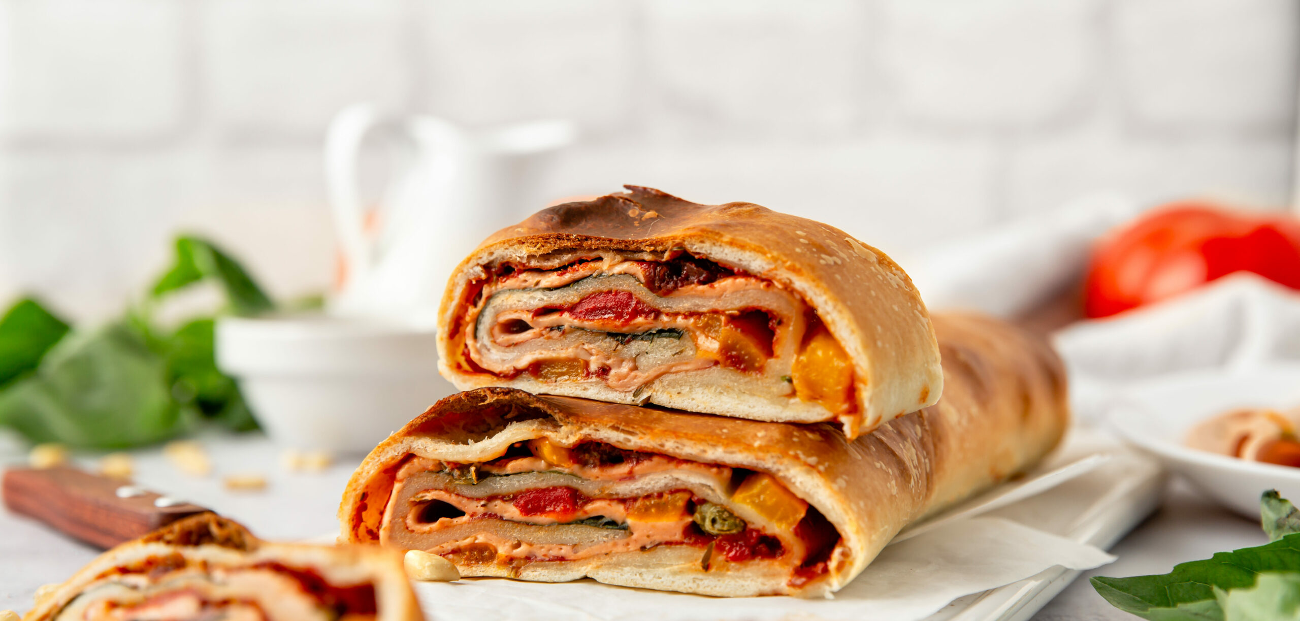 Préchauffer le four à 200°C et recouvrir une plaque de cuisson de papier sulfurisé. Dans un bol, mélanger le concentré de tomate, l’huile d’olive, le vinaigre balsamique, l’origan, l’ail en poudre, le piment, saler et poivrer. Puis ajouter progressivement l’eau tout en mélangeant, jusqu’à obtenir une sauce homogène. Etaler la pâte à pizza en un carré d’environ 30 x 30 cm assez épais. Etaler la sauce tomate sur la pâte en laissant 2 cm libres autour des bords. Parsemer câpres et les tomates séchées coupées en petits morceaux. Puis recouvrir avec les poivrons marinés, les tranches Wheaty et déposer quelques feuilles de basilic frais. Rouler délicatement la pâte sur toute sa longueur, puis pincer et rabattre les extrémités pour bien la refermer. Déposer le Stromboli sur la plaque de cuisson, avec la jointure finale en dessous (côté plaque). Badigeonner de lait végétal. Enfourner pendant 20 à 25 minutes, jusqu’à ce que le Stromboli soit bien doré sur le dessus. Couper en parts épaisse et servir bien chaud accompagné d’une salade verte fraîche.